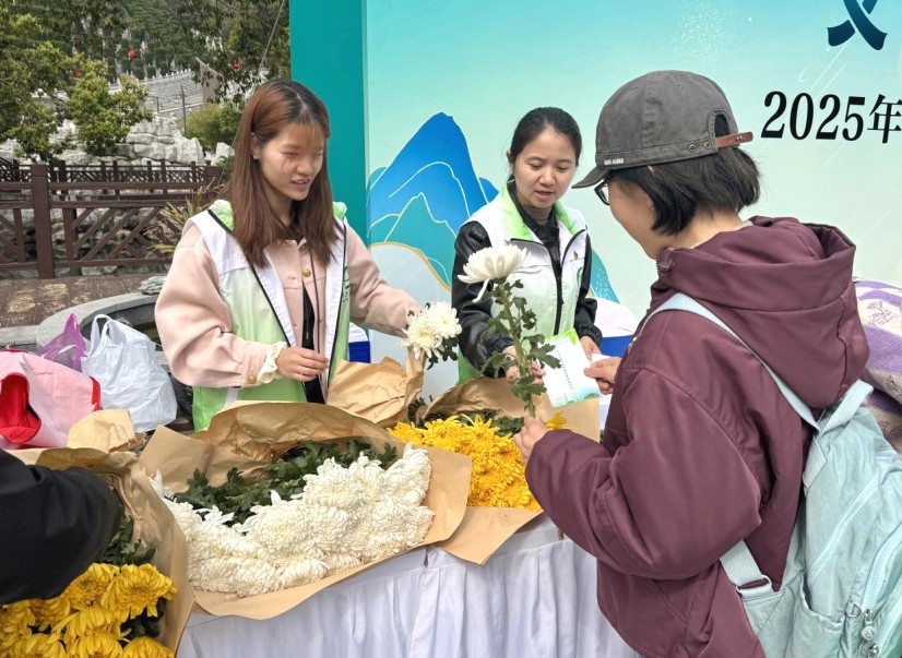 在郴州,市殡仪馆、香山陵园联合志愿者服务队开展移风易俗·绿色祭扫活动,用鲜花换鞭炮、纸钱和香烛,为前来祭扫的市民提供帮助和进行文明劝导。